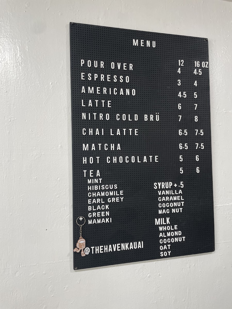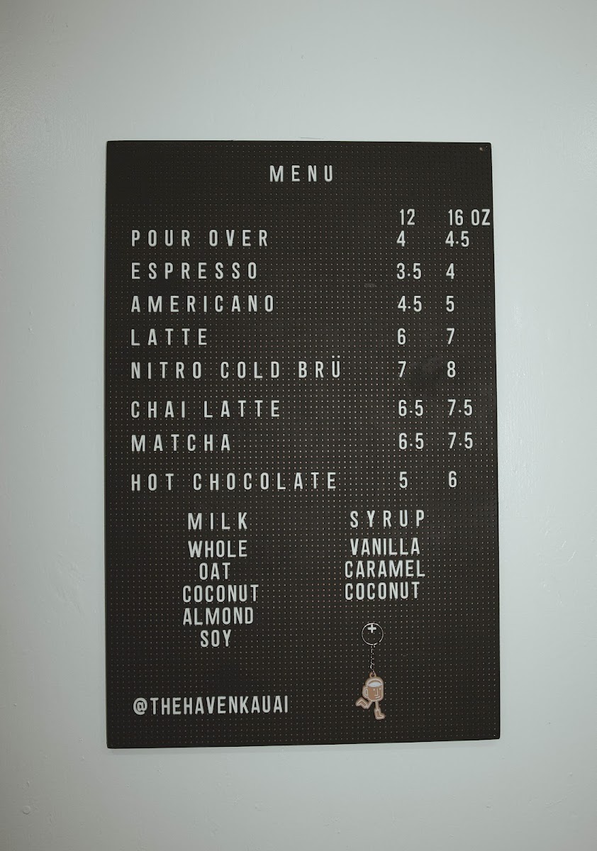 Introducing the menu at the haven, a charming coffee shop located on Kuhio Hwy in Hanalei, HI, is more than just a culinary experience; it’s a gateway to blissful moments. Here, you can indulge in a variety of meticulously crafted beverages. From robust cappuccinos and enticing lattes to refreshing nitro cold brew, each drink is designed to awaken your senses. The selection of syrups, including vanilla, lavender, and mocha, elevate your coffee to new heights. Customers rave about the unique Fruit Loops Matcha and decadent Banana Bread Latte, which exemplify the shop's whimsical yet satisfying touch. The cozy atmosphere, complete with comfortable patio seating, invites you to unwind post-adventure, just like Oksana Z who celebrated her trek with delicious croissants and matcha. The haven is a must-visit destination that combines great coffee with warm hospitality for an unforgettable experience.